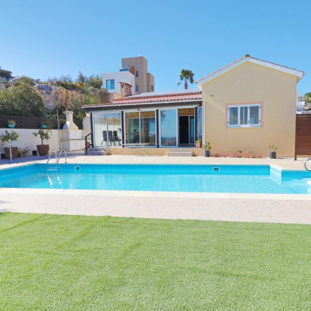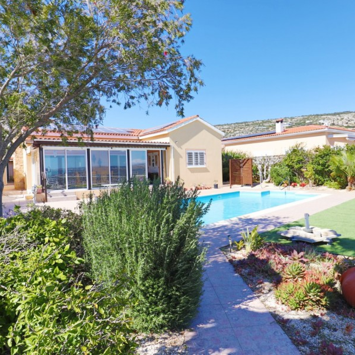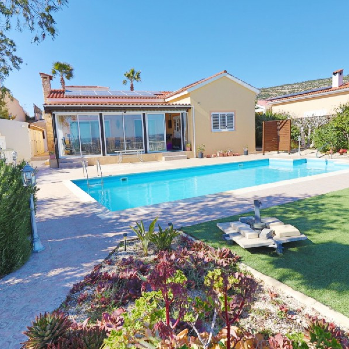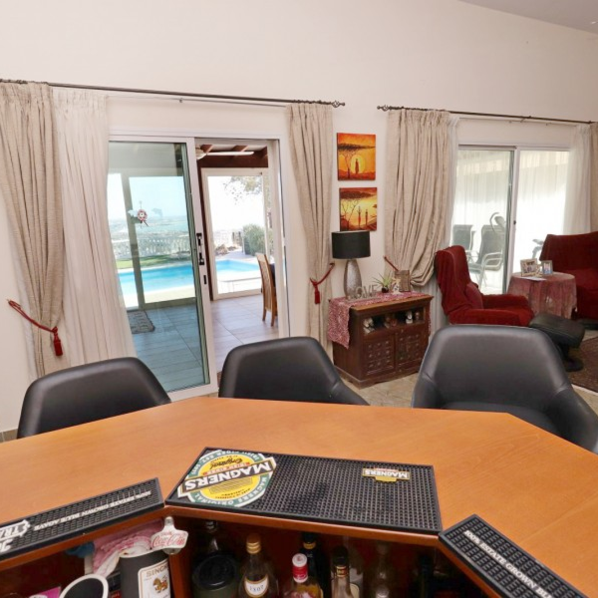 A Very Spacious 4 Bedroom Bungalow with Unobstructed Sea Views is For Sale in Peyia. This property is situated in a sought after neighborhood of Peyia, popular for the beautiful sea views and quietness, within easy access to Peyia Square and Coral Bay beach and resort. The views from this property are breathtaking !!! Parking your car in your own private covered parking you will find the entry way. Upon entering you will be greeted by the large entrance hall. On your left you will find the two very spacious bedrooms with the large family bathroom. There is also the master bedroom with en-suite facilities on the other side enjoying magnificent sea views. You will also find the office / study room. You will find the very spacious fully equipped kitchen with granite worktops with a kitchen island and the utility room. Ahead is the lounge and dining area with a secondary sitting area with a fireplace and a beautiful bar overlooking the Mediterranean Sea. From there sliding doors takes you to the covered veranda and outdoor area. Stepping outside it will take your breath away. You will find the large private heated swimming pool with perhaps the most beautiful sea, mountain and nature views. There is also a BBQ area, outdoor toilet and shower, plenty of storage space and sitting / relaxation areas. The property has the added benefit of having photovoltaic panels, central heating and unobstructed sea views. Overall this is a beautiful home, very well maintained with lots of extras, making this property ideal as a permanent residency or as a holiday retreat.