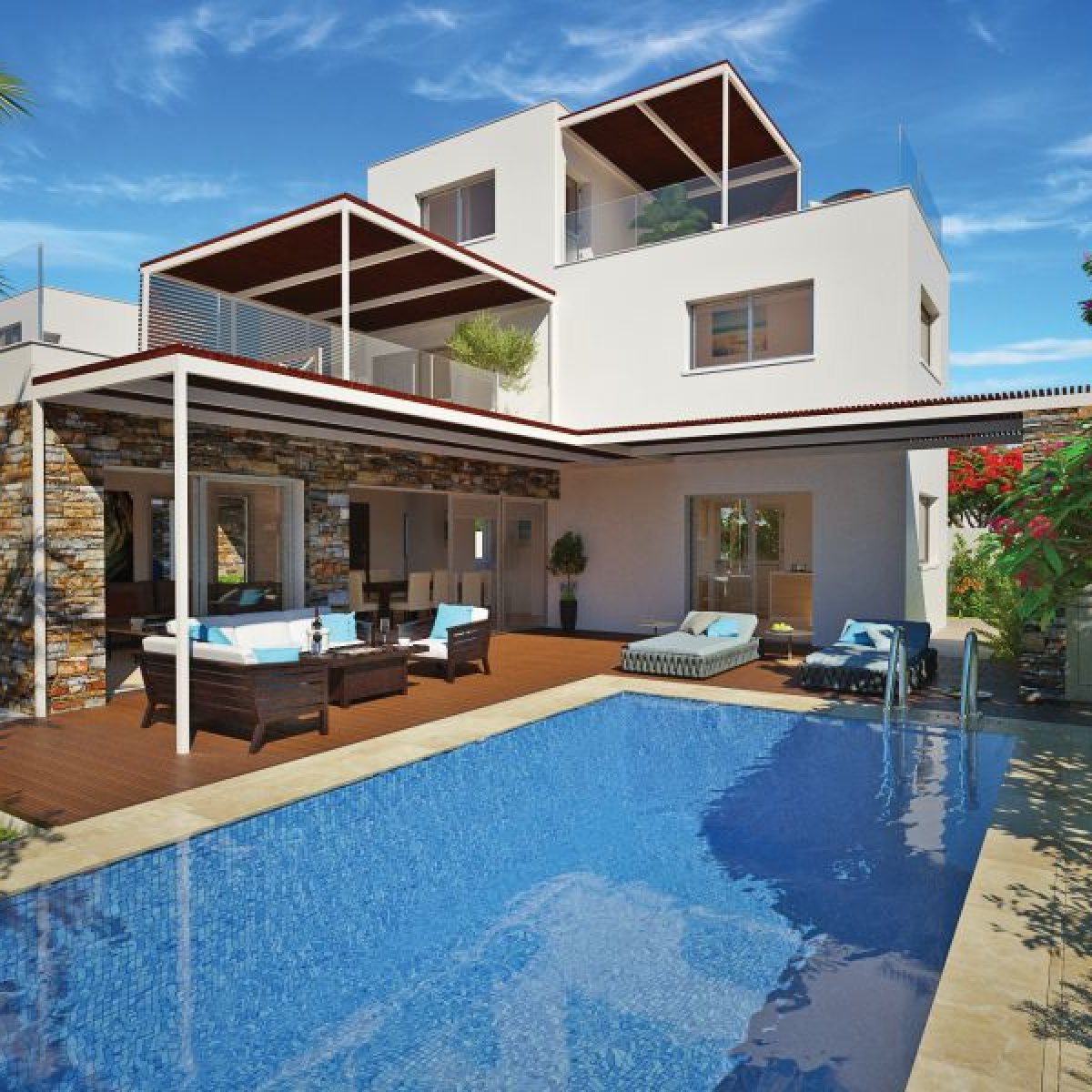 4 bedroom Villas in  a modern coastal development  for sale in Paphos located in the heart of the tourist area. The villas are designed in large plots and enjoy large terraces and private swimming pools. The development is located in front of one of the most famous sandy beaches in Paphos and enjoys easy access to a variety of restaurants, pubs,  beach bars, 5-star hotels, the Paphos waterpark and the Kings Avenue Mall.
